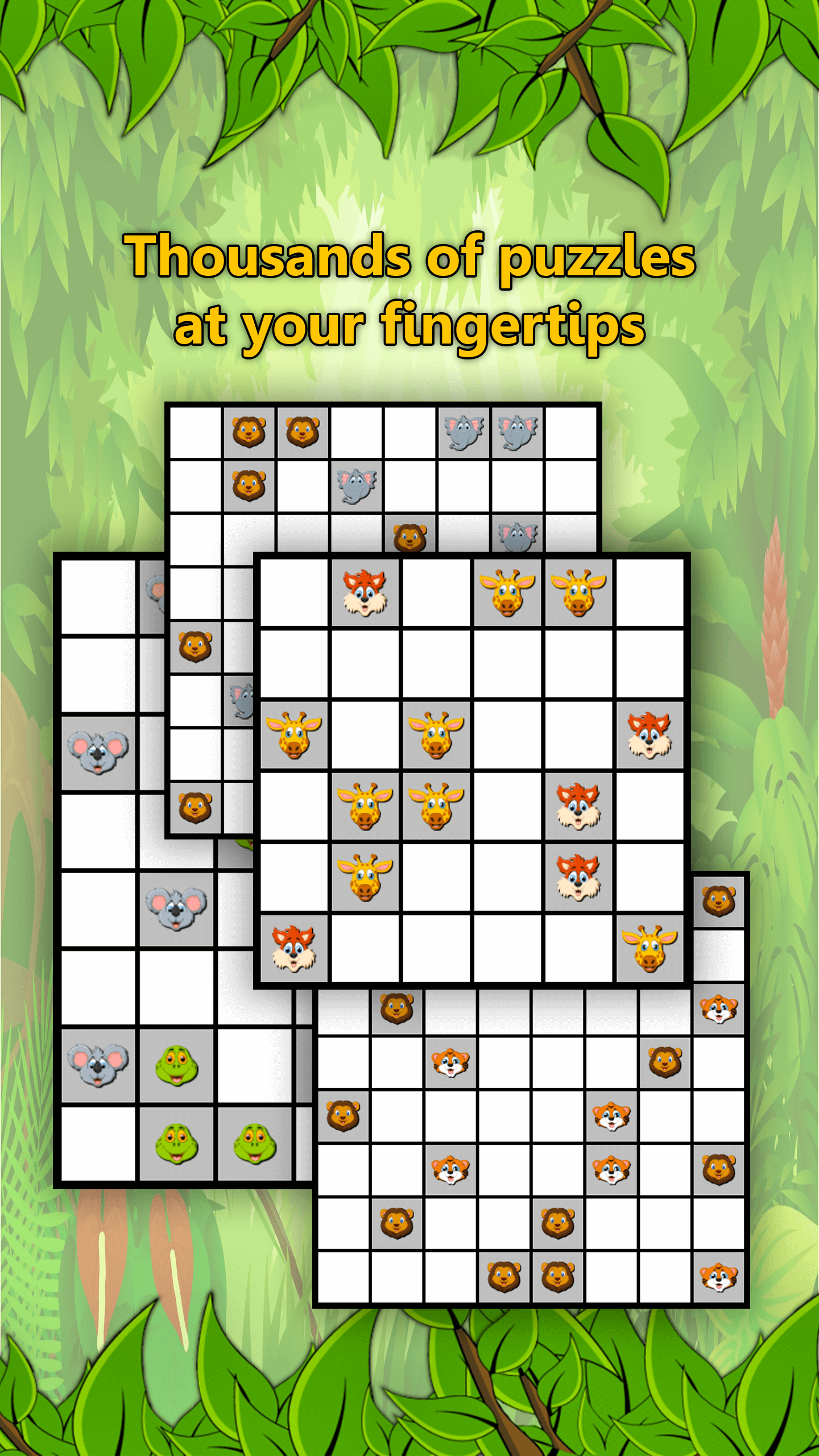 Hundreds of unique grids to play with funny animals. We can guarantee your kid(s) and you hours of fun and logic.